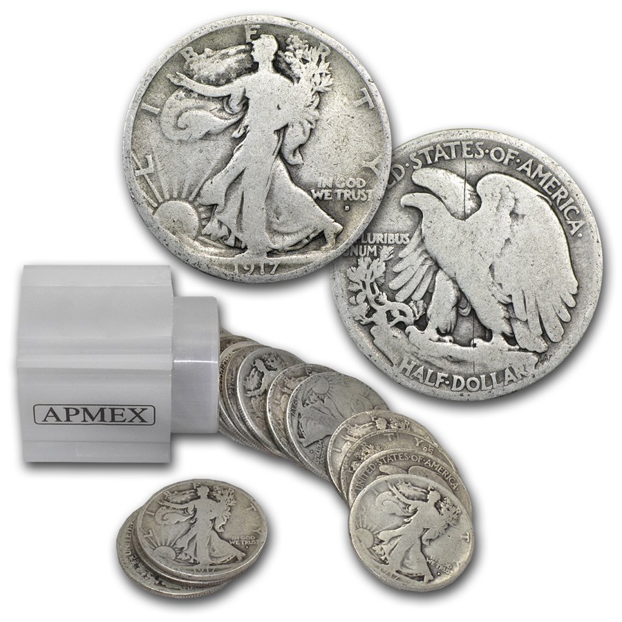 1917-D Obv Walking Liberty Halves 20-Coin Roll Avg Circ
